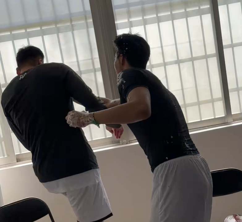 后续焦泊乔还在欺负李炎哲。因为之前他们都是一个球队了,即便现在都加盟各个球队了,关系还是非常好。我们明显可以看到焦泊乔特地过去,然后将蛋糕抹在李炎哲的脸上。